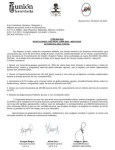 Según los detalles que expresa el comunicado oficial, que lleva la firma del Secretario General de Unión Feroviaria, Sergio Sasia, junto a Enrique Maigua, A.S.F.A. y Adrián Silva A.P.D.F.A; lo firmado incluye el pago de «una suma remunerativa equivalente al 7.65% del salario bruto total, incluido el salario básico y todas las bonificaciones, viáticos y antigüedad, sobre las grillas salariales vigentes, que se liquidará con boleta suplementaria durante mes noviembre», y «un Importe remunerativo de sesenta y cinco mil pesos, que se liquidará con boleta suplementaria durante la primera quincena» del mismo de este año.